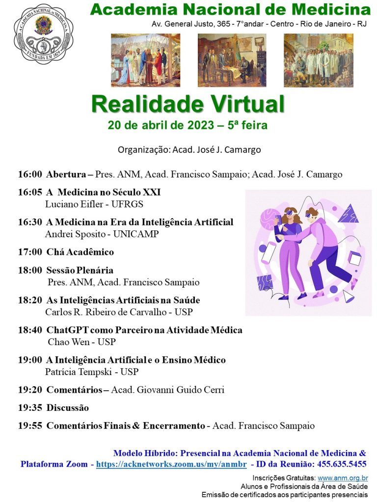 O uso de inteligência artificial (IA) está sendo cada vez mais abordado, e foi tema do simpósio da última semana na Academia Nacional de Medicina (ANM). O assunto Realidade Virtual foi organizado pelo Acadêmico José J. Camargo, com intuito de mostrar “o que já existe e o que está para existir em inteligência artificial, em relação à atividade e ensino médico”, afirmou o Presidente Acad. Francisco Sampaio.